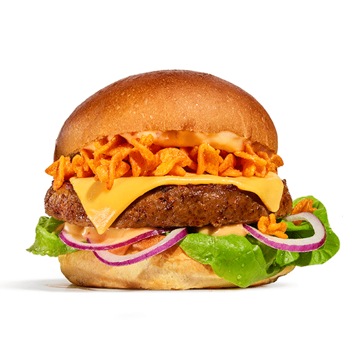 150 gram beef burger met Doritos Bits, sla, rode ui, cheddar en huisgemaakte chilimayonaise op een getoast brioche broodje
